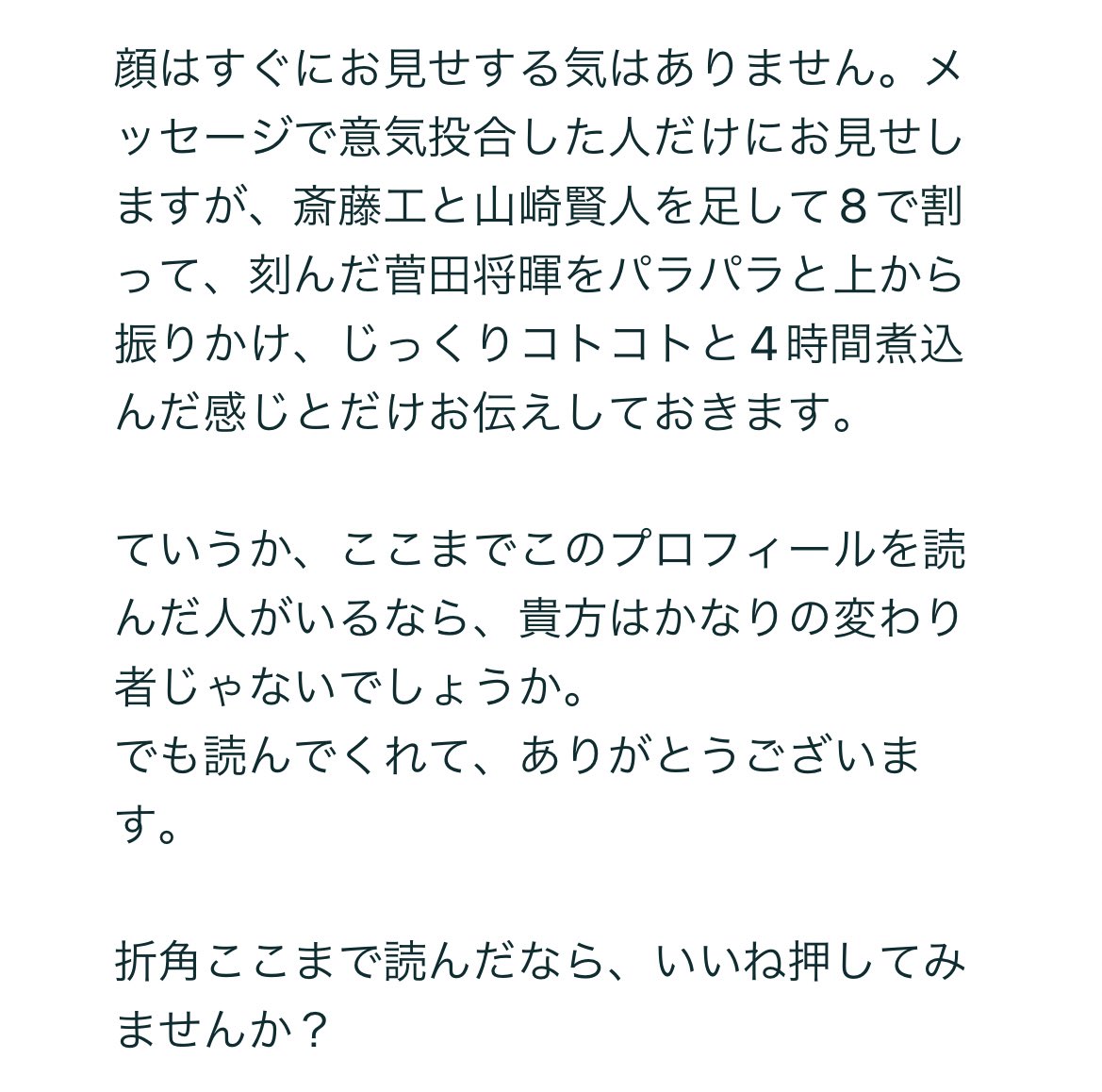 先日、某マッチングアプリでいいねして下さった、顔写真無しの男性👱♂️ 自己紹介文が斜め上過ぎて素晴らしかった(色んな意味で)ので、ぜひシェアさせてください🪐