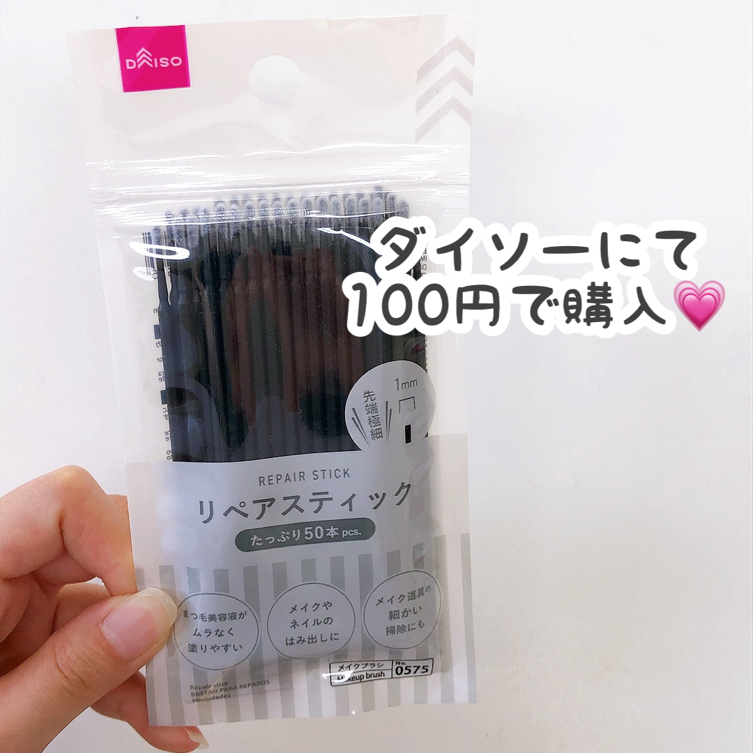 ダイソー『リペアスティック』 先端が極細で、なんと1mm😲 細かい部分の修正に優秀過ぎる! まつ毛美容液がムラなく塗りやすかったり、 リムーバーを含めると、ネイルやメイクのはみ出し修正にも便利❣ 様々な用途で使うことが出来ます(*&039;▽&039;)