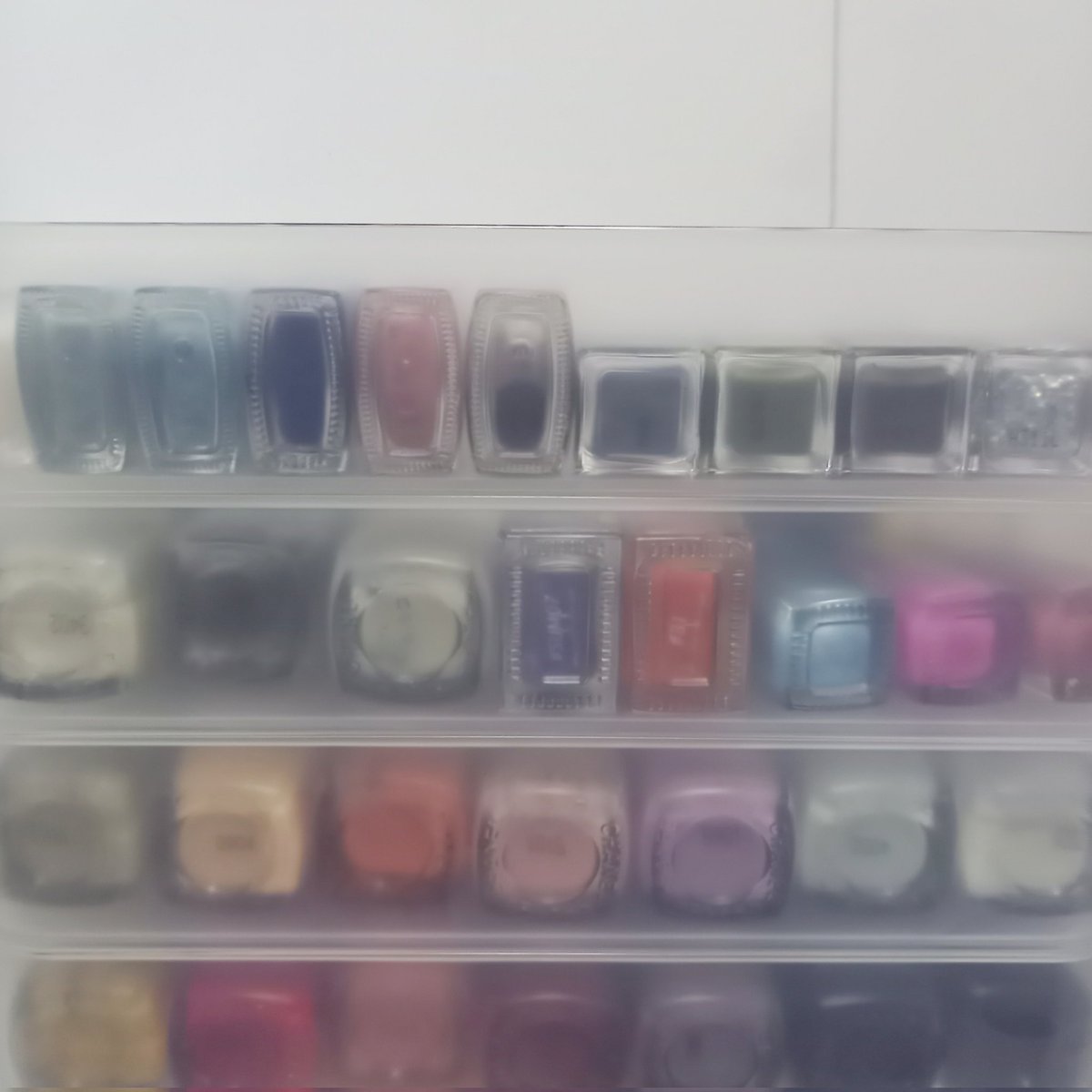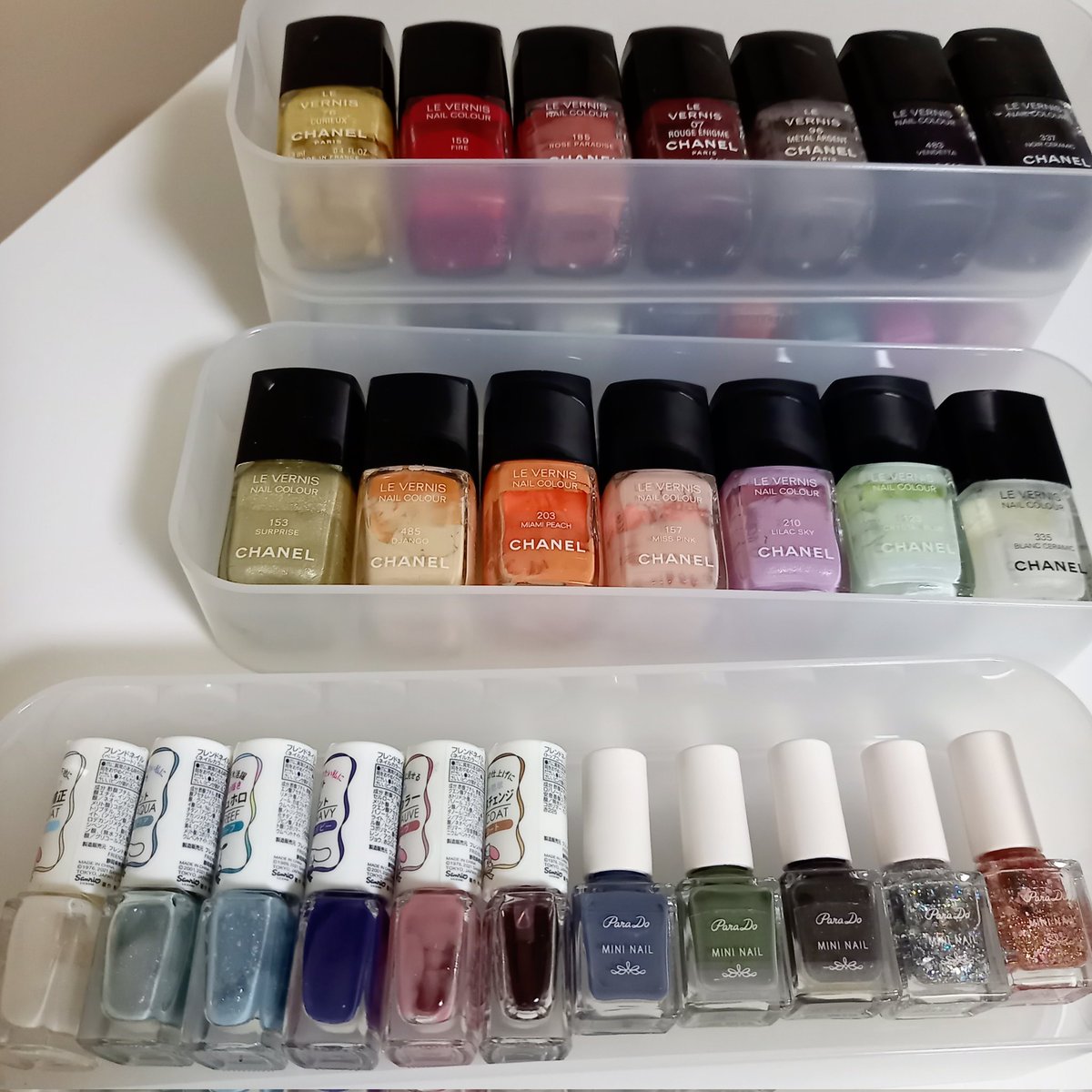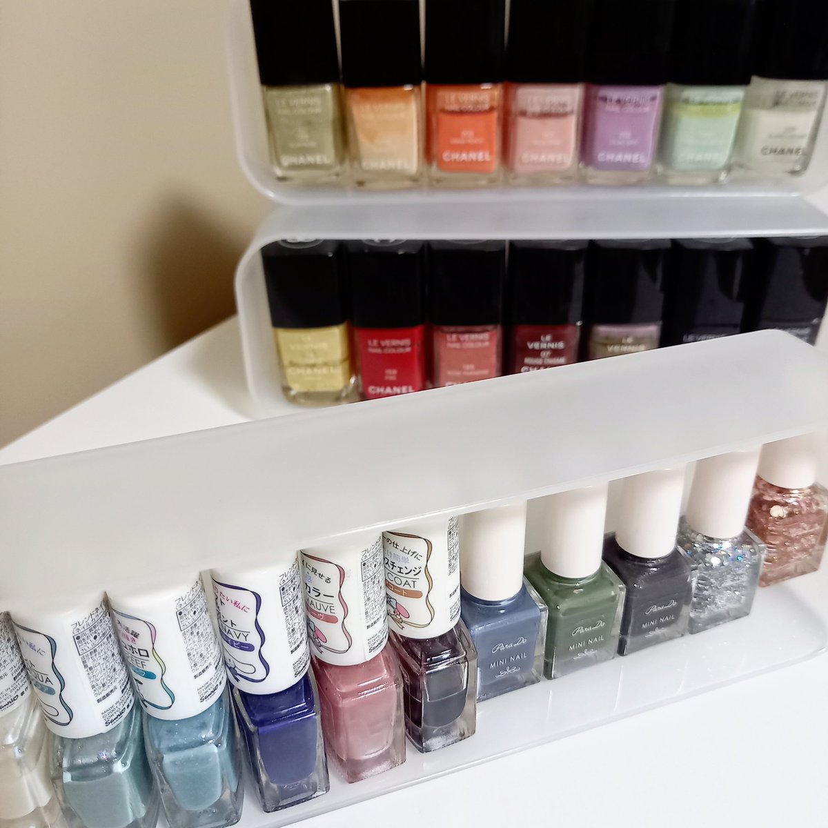 ネイルの収納にずっと悩んでて、もう!横倒しでもいいや!ってなってダイソーの重ねられるケースに入れたんだけど、結構便利かも🤔縦にもできるし