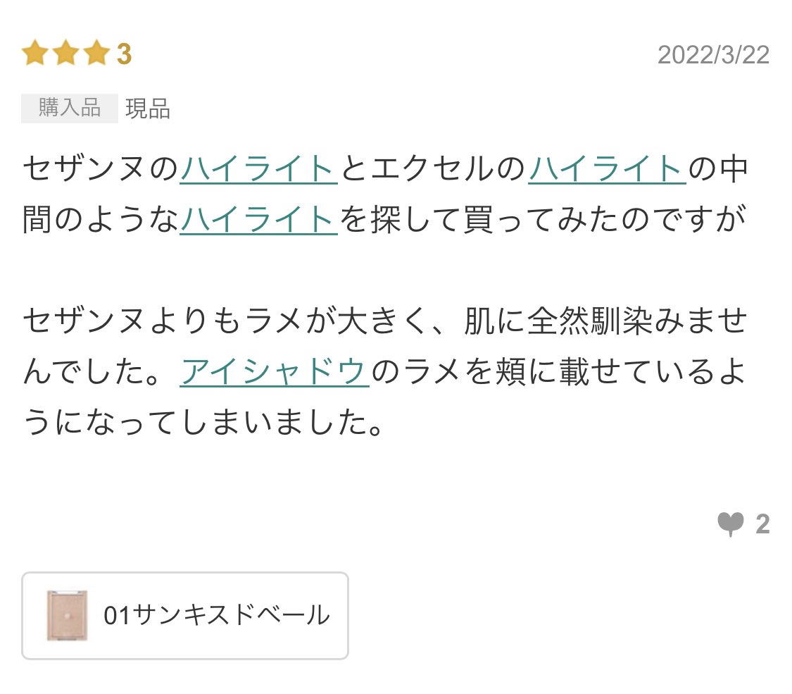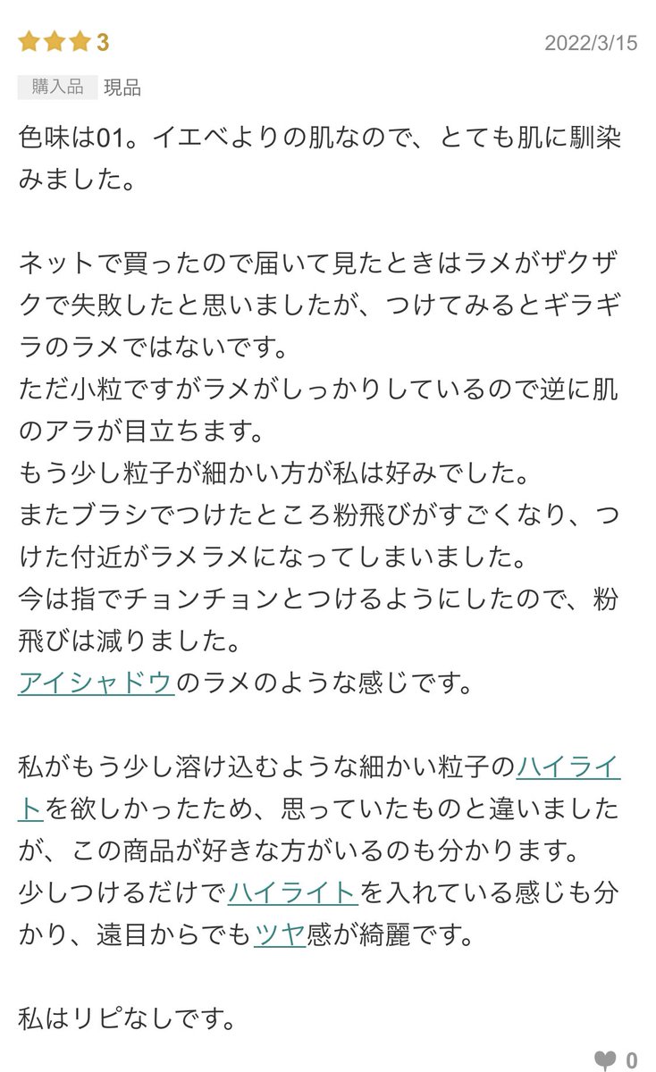 昨日購入したロムアンドのハイライト、実際肌に乗せてみたらラメ感強くて失敗した。今までセザンヌのパールグロウハイライトを使っていたので余計にそう感じる。 私はラメゴミ化しやすいイエベ秋だからツヤ感は絶対にパールで仕込みたい派。これだと逆に肌の粗が悪目立ちしてしまう。自分と似たような
