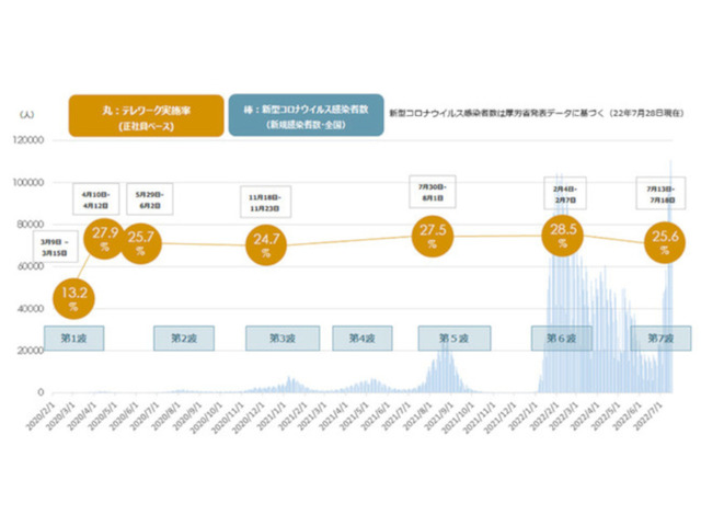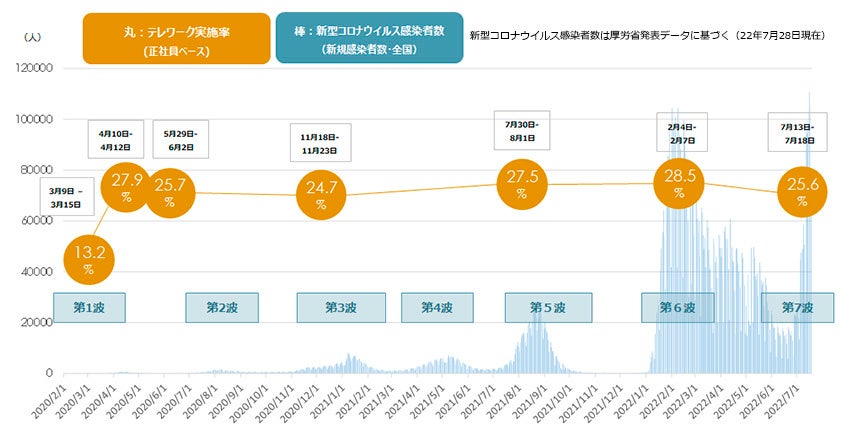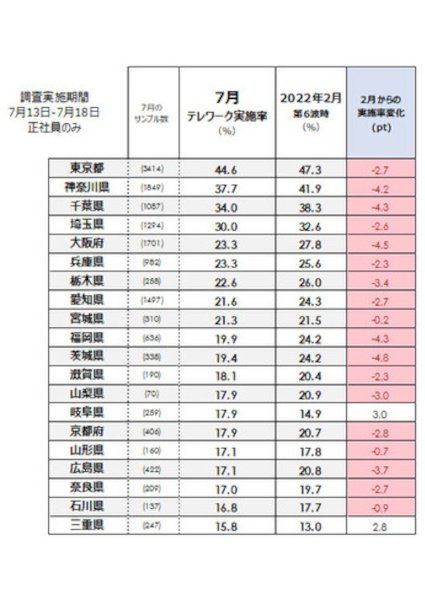 新型コロナ感染第7波における正社員のテレワーク実施率は全国平均で25.6%。第6波時と比べ、47都道府県のうち39都道府県で減少