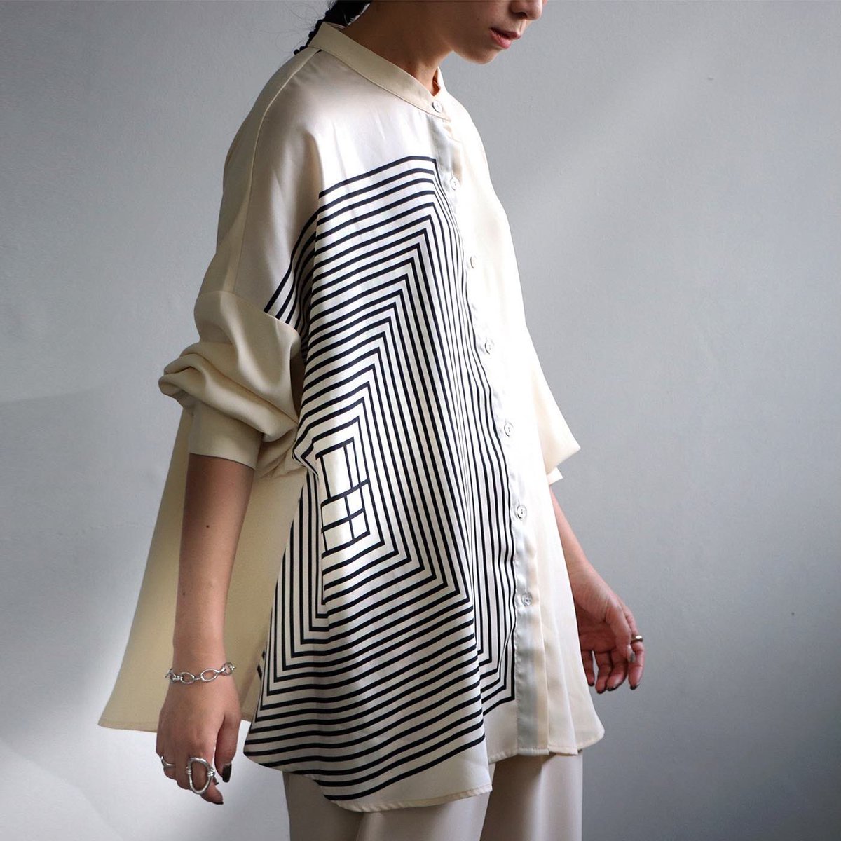 シルエットも柄もアシンメトリーに組み合わせた一枚で目を惹く、モード感たっぷりのシャツ。 生地は光沢でのある綺麗めなポリエステル素材で、羽織としても大活躍してくれます🎶 シンプルなボトムと合わせるだけでおしゃれ上級者に✨
