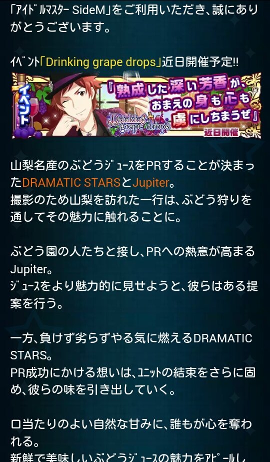 あ、sideMくんの次イベントのこの「ぶどうジュース」逆転裁判4とドラマ版孤独のグルメ履修してるから知ってるぞ!! 飲み過ぎると医者から止められるタイプぶどうジュースだ!!