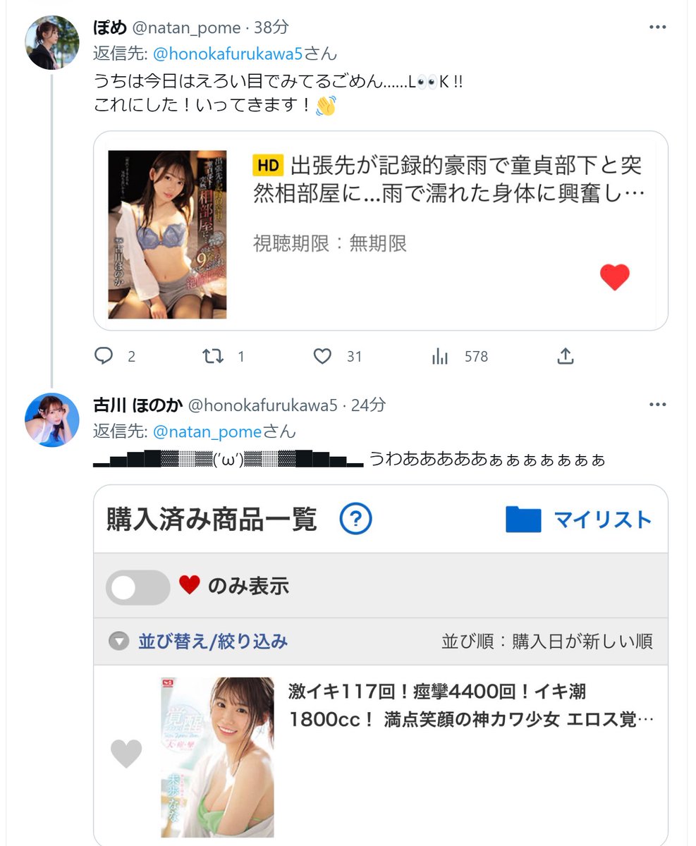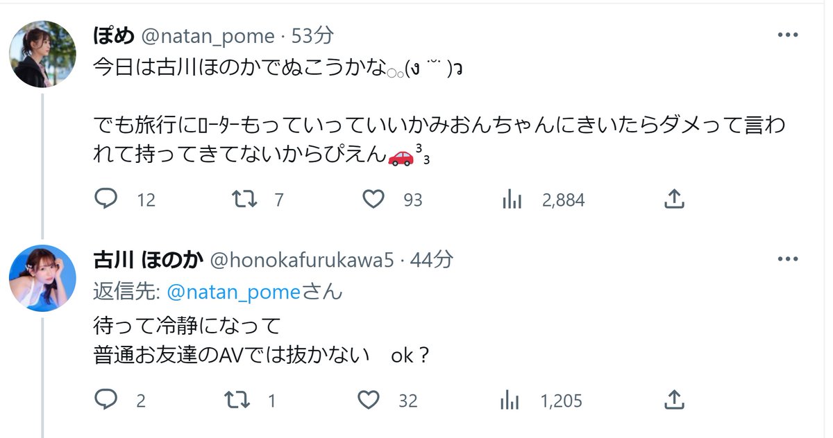 セクシー女優【未歩なな】サンと【古川ほのか】サン 未歩「今日は古川ほのかでぬこうかな」 古川「待って冷静になって 普通お友達のAVでは抜かない ok?」 ・・・二人の会話だけでヌケる説。 登場人物解説 ぽめ=未歩ななサンのサブ垢 古川ほのかサン みおんちゃん=桜木美音サン