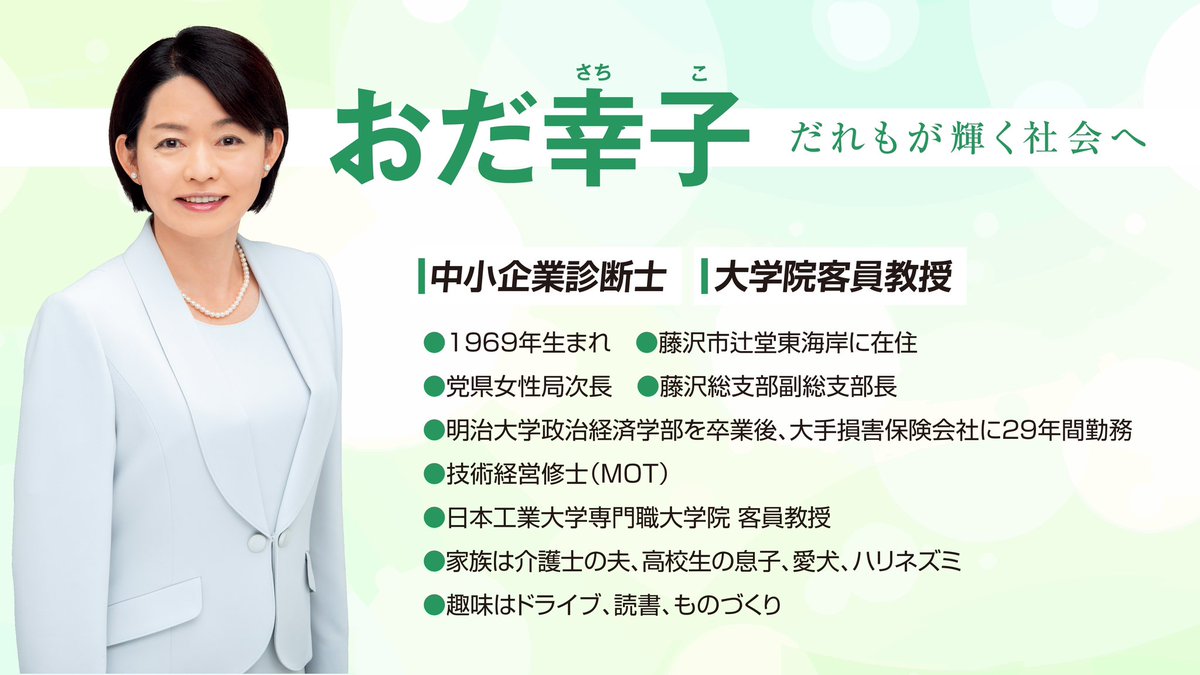 統一地方選挙2023 令和五年四月九日・投票日 神奈川県議会議員選挙 (藤沢市選挙区) 公明党 【おだ幸子】党公認候補 がんを患いながら 障がいのある息子を育て 更に母親の看護と介護を経験 現在はがんを克服 全国で300社超の経営診断をし 中小企業支援政策を展望する おだ幸子 お頼み申し上げます