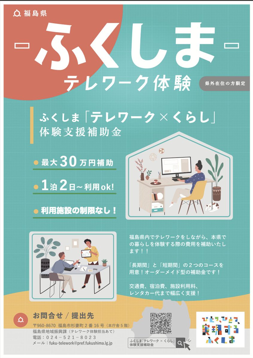 福島のテレワーク支援補助金が手厚すぎる!!!! 以下の補助対象経費の3/4を負担してくれます ・交通費 ・レンタカー代(燃料費は除く) ・本県に滞在している間の宿泊費 ・コワーキングスペース等の施設利用料 ・補助上限額 【長期コース】30万円…