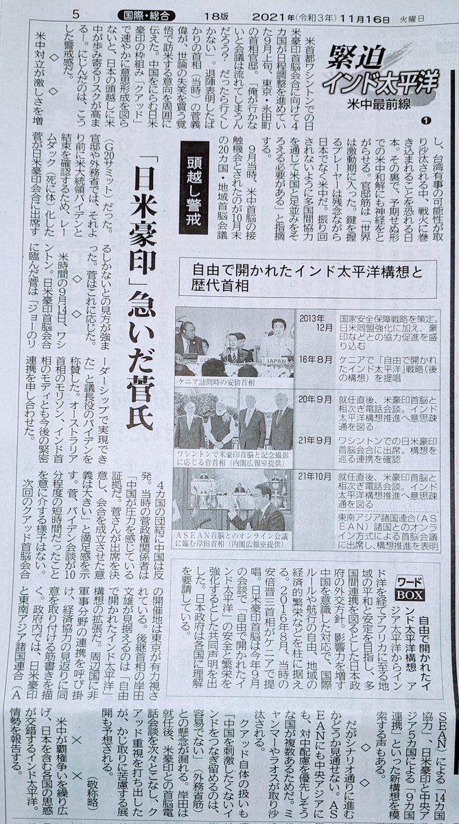 衆議院選挙で埋もれてしまいがちだったが、レームダックした菅前首相がQUAD首脳会談をぎりぎり行えた功績は決して小さくないと思う。 苦い思いを超え参加して下さった事に感謝したい。 米中が和解したとて経済安全保障の枠組みを今後も育てていってほしい。 QUAD 自由で開かれたインド太平洋