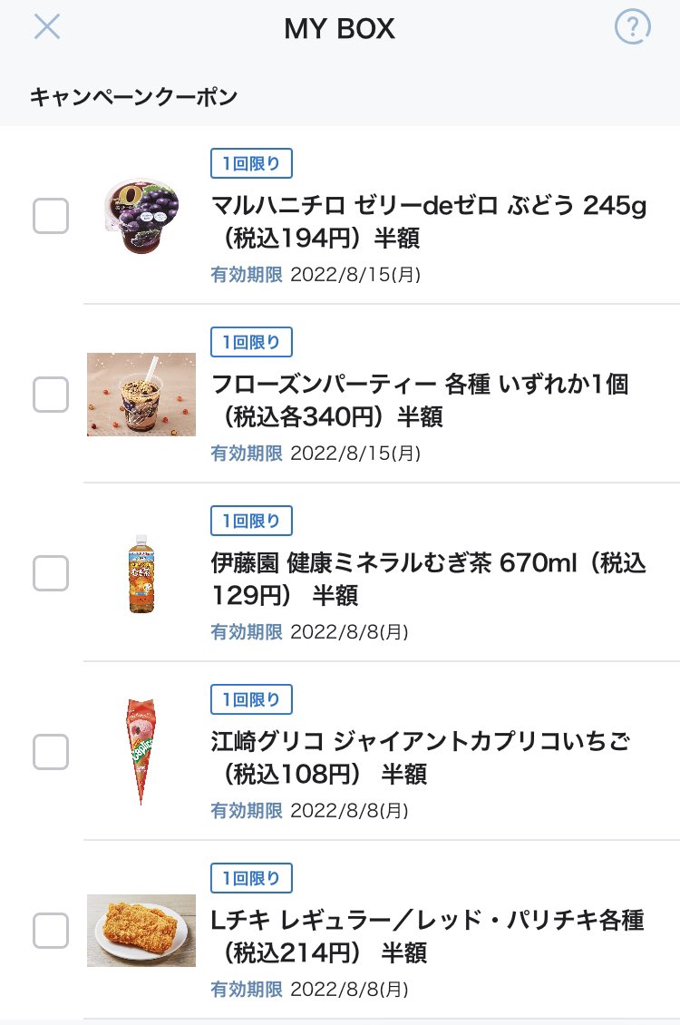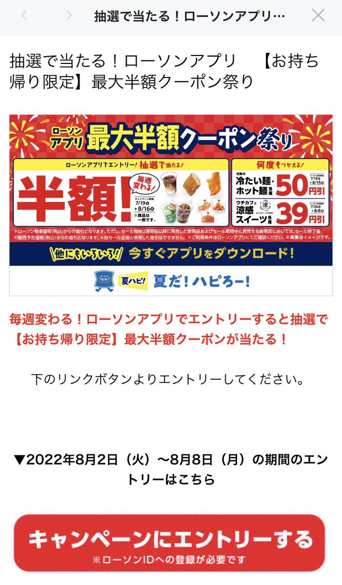 ローソンアプリで最大半額クーポン祭り実施中🦀 7月19日からチャレンジして5つのクーポンに当選しました🎉 みなさんは何か当たりましたか? 午後からもよろしくお願いします🙌 ローソン
